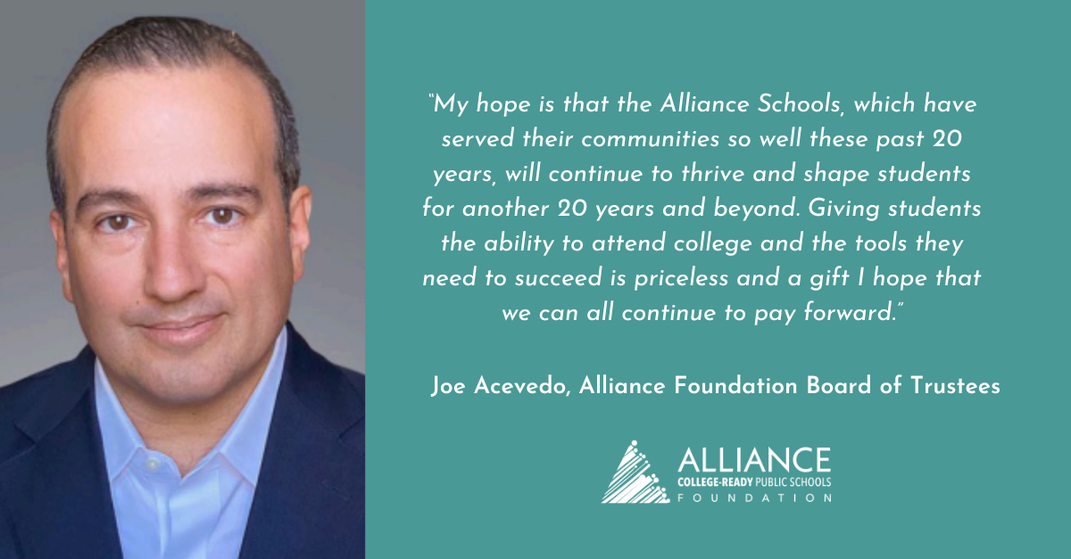Alliance welcomes Joseph Acevedo to the Alliance College-Ready Public Schools Foundation Board of Trustees.